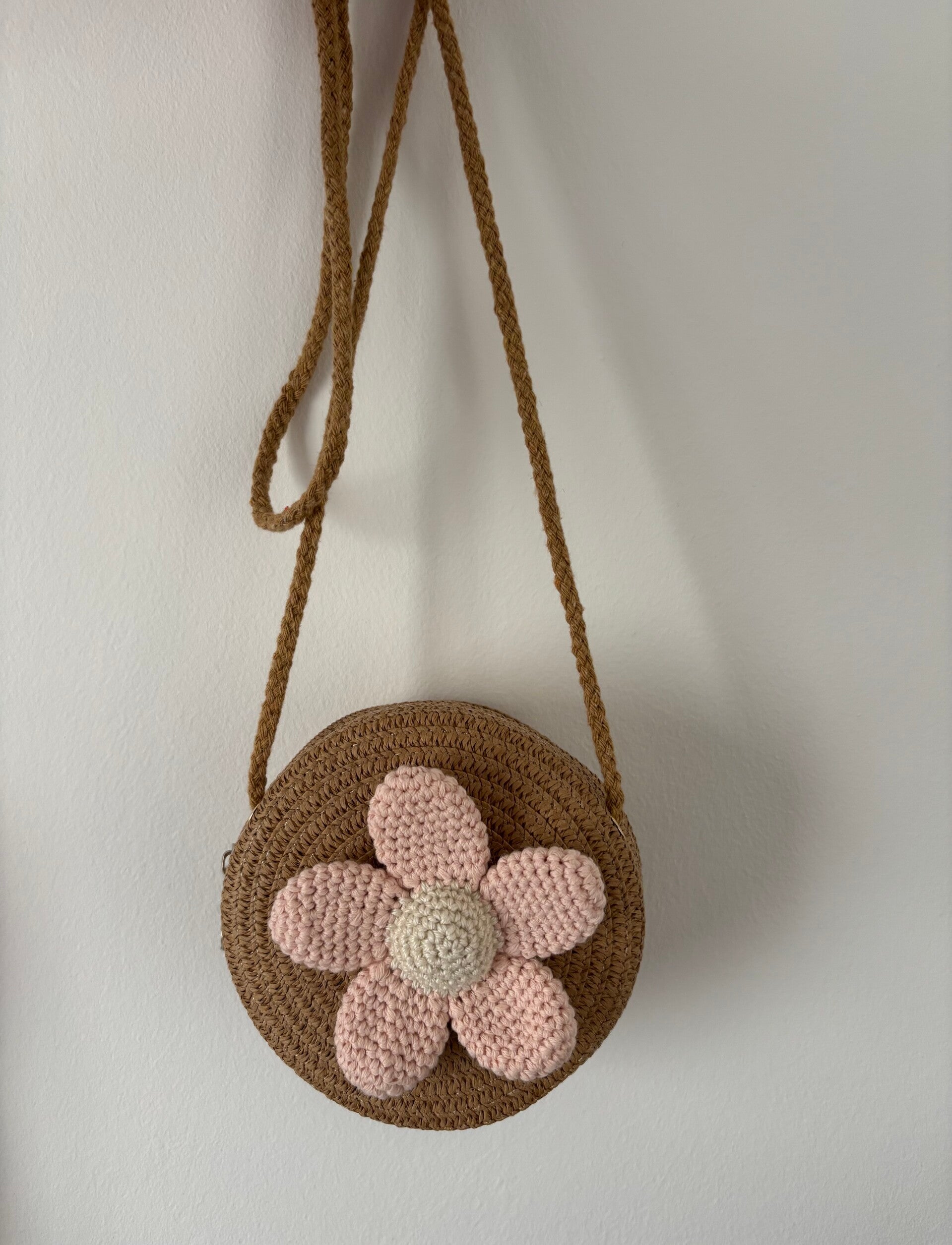 Een super schattig tasje voor kleine meisjes met een gehaakte bloem erop. Het tasje is ongeveer 12 cm.